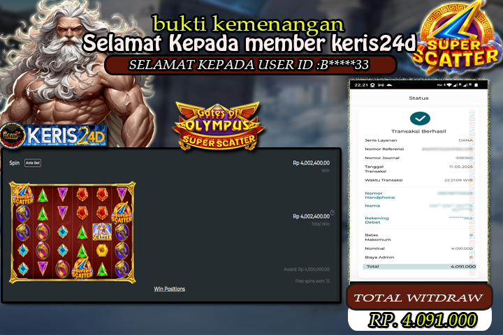 KERIS24D dikenal sebagai situs terpercaya yang selalu menghadirkan pengalaman bermain slot online yang aman, fair, dan berlisensi resmi. Di sini, kami tidak hanya sekadar memberikan janji, tapi bukti nyata berupa slip kemenangan yang dapat Anda lihat secara langsung.