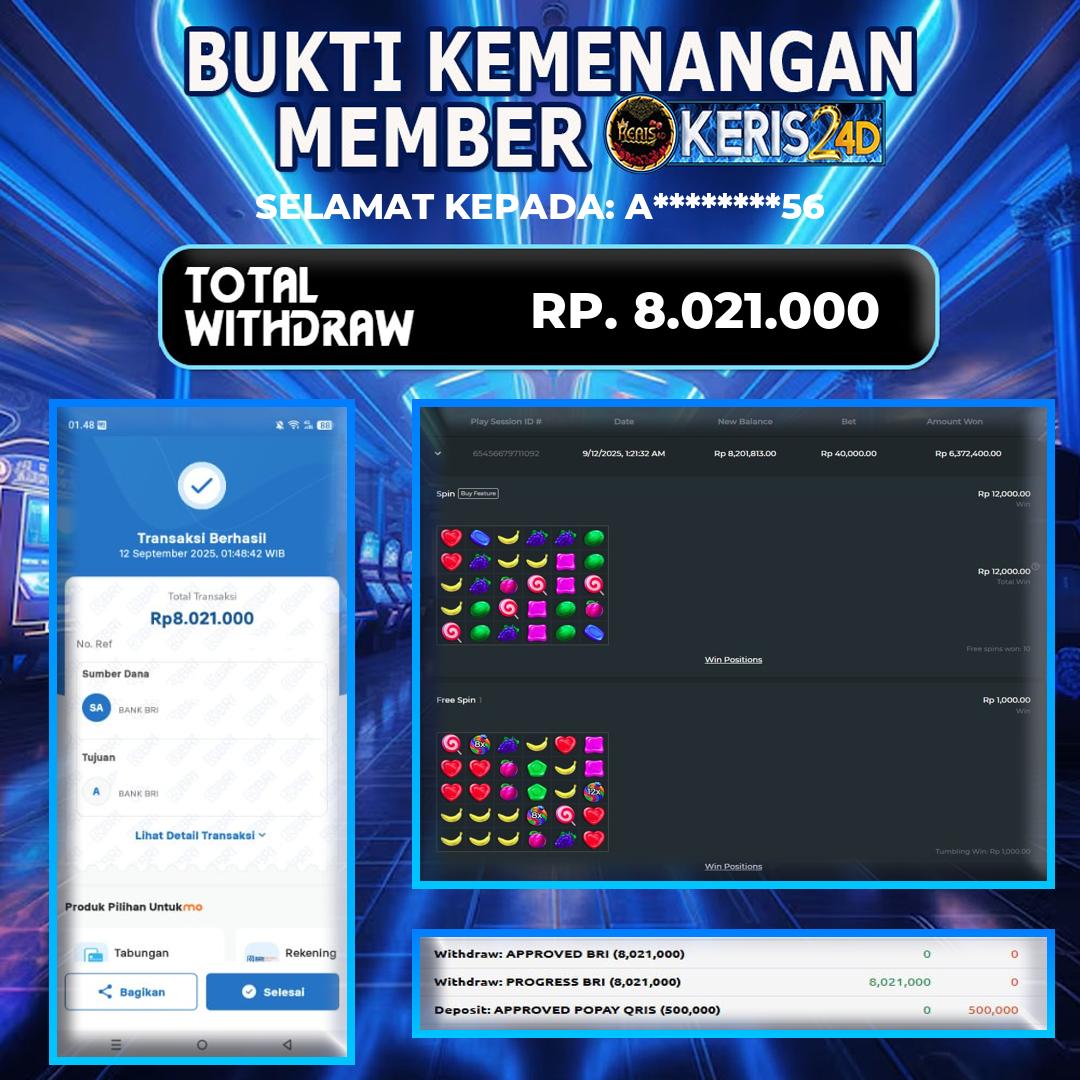 Setiap hari, member KERIS24D berhasil meraih jackpot besar dari berbagai provider slot ternama yang kami sediakan, seperti Pragmatic Play, Habanero, PG Soft, dan masih banyak lagi. Kami secara rutin menampilkan bukti screenshot atau rekapan kemenangan yang berhasil diraih, mulai dari kemenangan ratusan ribu hingga puluhan juta rupiah. Semua slip kemenangan ini kami hadirkan untuk membuktikan bahwa di KERIS24D, peluang menang itu nyata.