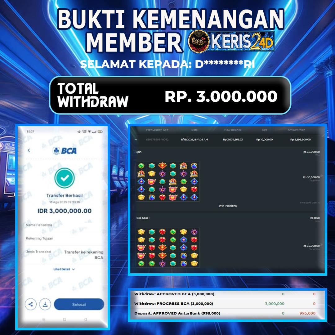 Setiap hari, member KERIS24D berhasil meraih jackpot besar dari berbagai provider slot ternama yang kami sediakan, seperti Pragmatic Play, Habanero, PG Soft, dan masih banyak lagi. Kami secara rutin menampilkan bukti screenshot atau rekapan kemenangan yang berhasil diraih, mulai dari kemenangan ratusan ribu hingga puluhan juta rupiah. Semua slip kemenangan ini kami hadirkan untuk membuktikan bahwa di KERIS24D, peluang menang itu nyata.