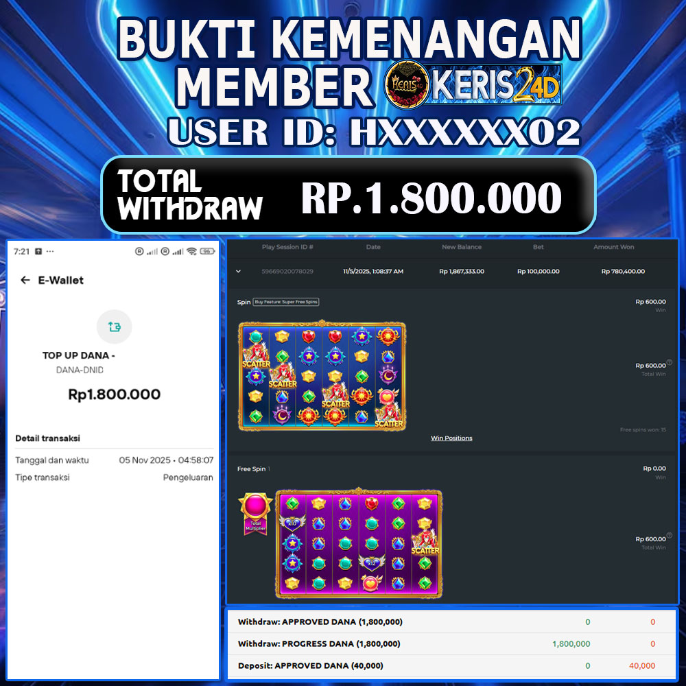 Setiap hari, member KERIS24D berhasil meraih jackpot besar dari berbagai provider slot ternama yang kami sediakan, seperti Pragmatic Play, Habanero, PG Soft, dan masih banyak lagi. Kami secara rutin menampilkan bukti screenshot atau rekapan kemenangan yang berhasil diraih, mulai dari kemenangan ratusan ribu hingga puluhan juta rupiah. Semua slip kemenangan ini kami hadirkan untuk membuktikan bahwa di KERIS24D, peluang menang itu nyata.